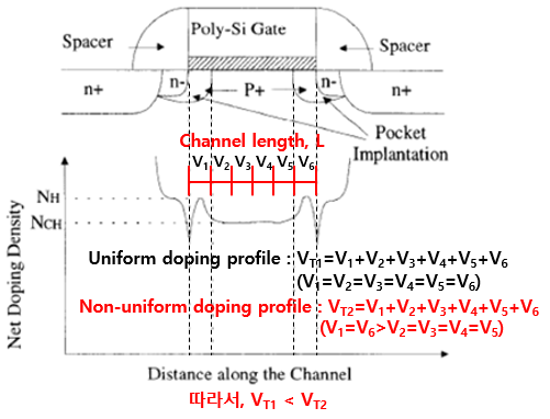 간단하게 설명드리자면, channel length를 같은 구간으로 여러개 쪼갬으로써 직렬 구조의 회로라고 생각했을 때, uniform body doping profile의 경우 각각의 세분화된 채널을 형성하기 위해 필요한 gate voltage를 각각 V1~V6라고 표현했을 때, V1~V6 모두 같은 값을 가질 것입니다. (좀 더 자세히 설명하면, Short channel device에서는 Drain voltage에 의한 depletion region 전하 공유에 의해 V1, V6 < V2~V4 가 되기 때문에 Threshold voltage가 작아지는 이슈가 발생하는 것입니다.) pocket implant에 의해 source와 drain 부근에 p+doping을 해주었을 경우, 우리는 문턱전압의 식이 떠오를 것입니다. body doping 농도 Na를 높일 경우 threshold voltage가 높아지는 것을 배웠으니깐요. pocket implantation 한 부분은 p+도핑이 되었기 때문에 세분화된 채널을 형성하기 위한 threshold voltage, V1과 V6는 나머지 보다 더 큰 Threshold voltage를 요구할 것입니다. 그래서 전체 채널을 형성하기 위해 필요한 threshold voltage가 증가하는 것입니다.