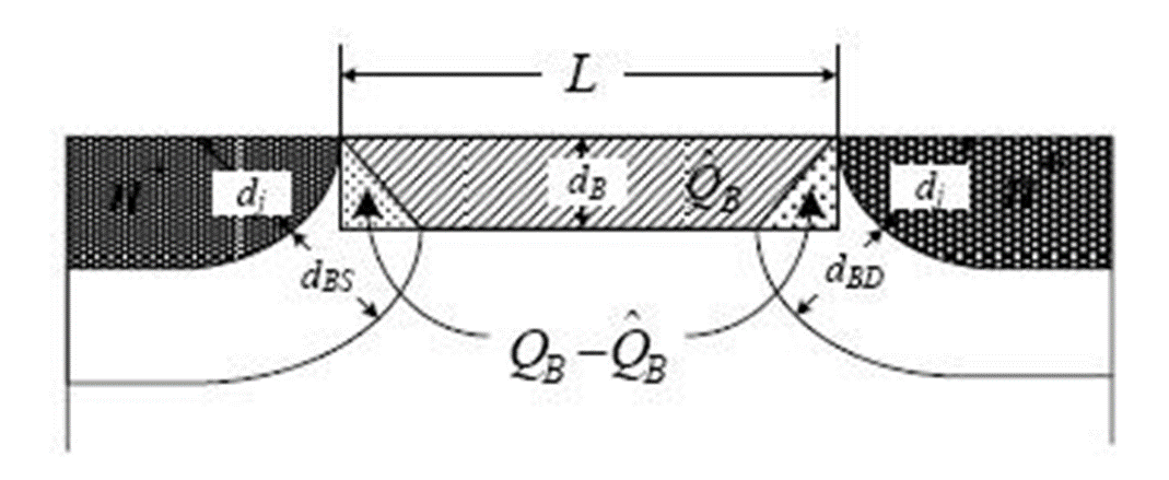 위 그림처럼 pn junction에서 depletion region이 형성으로 인해 charge가 공유되면서 (삼각형 부분), depletion region의 width가 maximum, Wdmax이 되기 위해 oxide에 가해주는 gate 전압이 줄어들게 됩니다. charge sharing에 의해 기존의 threshold voltage, Vt보다 더 작은 전압으로 depletion region width가 maximum에 도달하여 channel을 형성하기 때문에 short channel device에서 threshold voltage, Vt가 작아지는 것입니다.