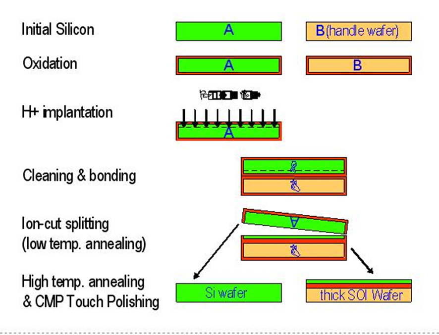 SOI Wafer를 제조하는 방법에는 여러가지가 있습니다. 두 장의 웨이퍼 중 한 장의 웨이퍼에 산화막을 성장시킨 후, 두 장을 맞붙이고 다른 한 장을 원하는 두께가 될 때까지 polishing 하는 방법의 경우 SOI 웨이퍼 1장을 생산하기 위해서 2장의 실리콘 웨이퍼가 필요하다는 문제가 있었습니다. 수 um의 얇은 두께의 실리콘 층을 형성하기 위해 수백 um의 실리콘 층을 갈아내어 제거해야 할 뿐만 아니라 두께가 얇아질수록 균일도를 유지하기 어렵다는 단점이 있었습니다. 하지만 일정한 에너지를 가지는 양성자 빔을 다량 주입한 후 열을 가해 박리되도록 하는 'ion-cut' 기술을 활용하면 한 장의 웨이퍼로 여러 장의 SOI wafer를 제조할 수 있는 장점이 있으며 얇은 두께의 웨이퍼 제조시에도 균일도나 막의 특성이 뛰어나다는 장점이 있습니다.