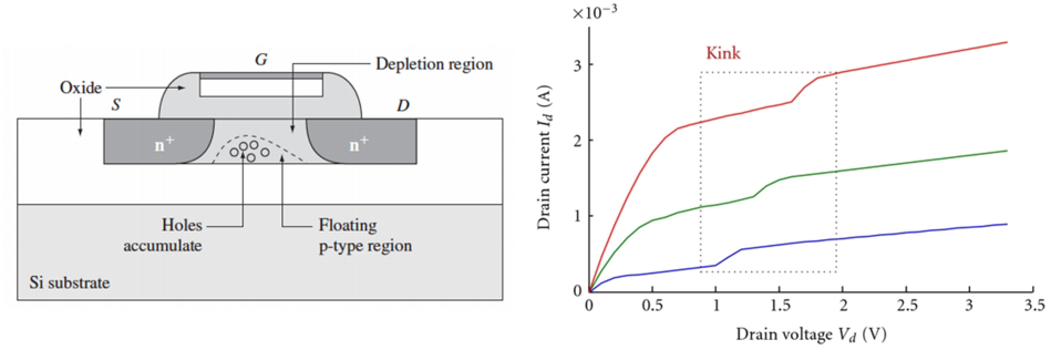 일반적으로 Bulk MOSFET보다 SOI MOSFET의 경우 current kink effect가 현저하게 발생합니다. impact ionization이 작을 경우에는 발생한 carrier들은 film body에서 재결합을 통해 소멸되지만 impact ionization에 의해 많은 양의 캐리어가 급격히 생성되면 일부는 film 안에서 재결합을 하며 나머지는 electric field를 따라서 source 쪽으로 이동하게 되고 전위 우물에 축적됩니다. 그 결과 gate와 drain bias가 인가되고 threshold voltage의 감소에 의해 특정 drain voltage에서 drain current가 급격히 증가하는 current kink effect 현상을 제공합니다.