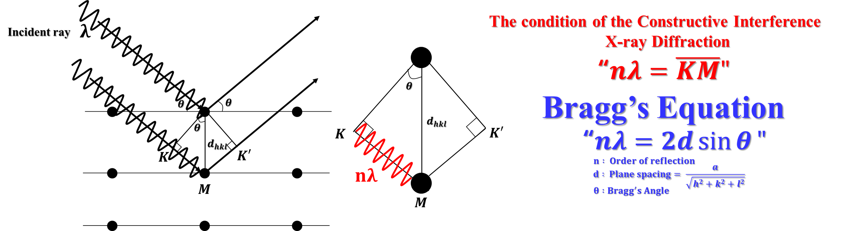 조금 더 정성적으로 접근할 경우, 임의의 결정 상태에서 d라는 원자 간격을 갖는 평행된 결정격자구조를 가질 때, θ의 각도로 X-ray를 조사하면 x선은 원자에 의해 모든 방향으로 산란합니다. 산란된 X선은 위와 같이 "KM=nλ"를 만족하는 X선은 간섭에 의해 강도가 강해집니다. 이것이 바로 Diffraction 회절현상입니다. 회절현상이 발생하는 조건은 위와 같이 X선의 파장 λ, 입사각 θ, 격자면간거리 d 사이에 다음과 같은 관계를 가집니다. "nλ=2dsinθ".