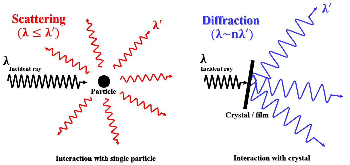 결정성이 약한(?), 무작위 배열의 소재의 경우 모든 방향응로 scattering 되므로 빛의 intensity가 약합니다. 하지만 주기성을 가지고 결정을 이루고 있는 소재는 특정 각도로 입사한 빛이 Bragg's law를 충족하면서 회절되면서 강한 intensity의 빛으로 detect 됩니다. Path difference : x(cosα-cosβ)