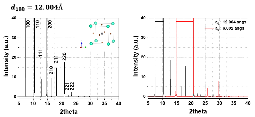 사실 위에 XRD 데이터는 시뮬레이션을 통해 얻은 결과입니다. 재미있는 것은 결정격자의 크기를 2배로 키우면 XRD data의 2theta는 1/2로 감소합니다. 이것은 모든 분광학 데이터에서 적용되는 것입니다.