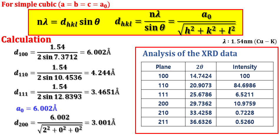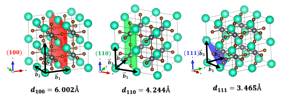hkl은 XRD data peak의 면지수이며, Bragg's law와 결정의 면간거리 계산식 그리고 면지수를 이용하여 결정격자의 격자상수를 구할 수 있습니다. 물질의 결정구조를 알고 있을 경우, 면지수를 이용하면 XRD 측정을 통해 얻을 수 있는 회절 패턴의 피크 위치를 계산함으로써 구할 수 있습니다. Perovskite nanocrystal의 면 방향에 따른 격자간 거리를 구했음.
