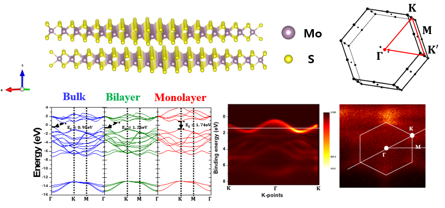 이것 또한 마찬가지입니다. MoS2는 bulk와 few layers에서는 indirect bandgap 특성을 갖지만, monolayer에서는 K-point에서 direct bandgap 특성을 갖습니다. 우측 데이터는 실제 입자가속기연구소에서 valance band의 band structure를 측정했던 결과입니다.