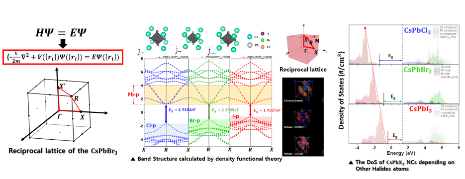 이건 제가 석사과정 중 DFT 계산을 통해 Halide 조성에 따른 energy bandgap이 변하는 특성에 대해서 계산했던 결과입니다. 그걸 떠나서, 좌측의 reciprocal lattice의 도메인에서 energy band structure를 표현할 수 있습니다.