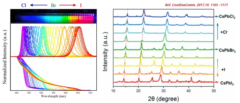 한 예로, 좌측은 제가 연구했던 perovskite 나노입자에 대한 음이온 치환에 대한 데이터입니다. 간단하게 설명드리자면, 양자점은 크기에 따라 emission wavelength가 다릅니다. 크기가 작아질수록 quantum confinement effect가 강해지면서 조금 더 단파장의 빛을 발광하죠. Perovskite 나노입자는 다른 양자점과 달리 halide의 원소가 무엇인지, 조성이 어떤지에 따라 방출 파장이 달라집니다. iodine의 조성이 많을수록 장파장, bromine은 녹색, chlorine이 많을수록 단파장으로 이동합니다. 그래도 양자점인지라 크기에 영향을 받는 것을 XRD data를 통해 확인할 수 있습니다. CsPbI3에서 CsPbCl3로 갈수록 peak와 peak 사이의 간격이 넓어지는 것으로 봐서 면간거리가 짧아지고 있다는 것을 알 수 있습니다. 실제로 CsPbCl3 나노입자의 크기가 CsPbBr3, CsPbI3 나노입자의 크기보다 작습니다.