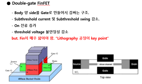 Bulk single gate 소자에서 누설전류를 줄이기 위해 Silicon-On-Insulator, SOI 기술이 도입되어 SOI Signle gate 소자 구조가 채택되었습니다. floating body effect로 인한 current kink effect를 억제하기 위해 fully-depletion 완전공핍형이 요구되면서 body thickness가 점점 더 얇아져야 했습니다. 하지만 body thickness를 줄이는데 한계에 봉착하게 되면서 body thickness를 줄이는 물리적인 depletion 형성이 아닌 하단에 gate를 하나 더 추가함으로써 electric depletion을 구현했습니다. 이를 SOI double gate 소자라고 합니다. 그 이후에는 FinFET, Trig-gate, Pi-gate, omega-gate 그리고 게이트가 전면을 둘러싸는 gate-all-around, GAAFET 3차원 구조로 발전했습니다.