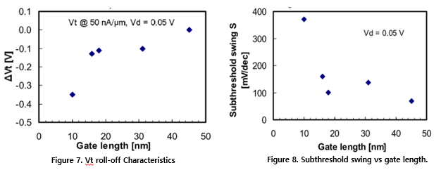 gate length에 감소에 따라 threshold voltage에 대한 변화량도 커지고, substhreshold swing 특성도 저하되는 것을 확인할 수 있습니다. 이러한 결과 FinFET은 5nm 이하에서 적용하기 어려운 것 같습니다. 그리고 FinFET 소자의 Fully depetion, 완전공핍 소자를 구현하기 위해서는 "gate length = Silicon body (width) = Silicon body (helight)"의 최적의 조건을 고려해서 Fin을 제작해야 합니다. 그렇기 때문에 FinFET technology가 미세공정으로 가면서, silicon thickness(body)와 silicon width(fin width)의 엄격한 specification이 요구됩니다. 그리고 여전히 FinFET은 gate length가 짧아짐에 따라, Vt roll-off/subthreshold 특성 저하 등 short channel effect는 여전히 FinFET에서 극복해야할 과제로 남아 있습니다.