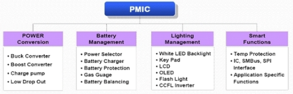 PMIC의 주요 기능은 전자기기 내부에 제한된 베터리의 전원을 다양한 부하에 따라 능동적으로 대처하고 베터리 전원을 효율적으로 관리하고 수명을 연장하는데 있습니다. 최적의 베터리 성능을 위해 시스템에서 필요한 전력을 알맞게 변환, 배분 및 제어하는 역할을 수행합니다. 즉, 전자기기 내의 베터리 관리, DC to DC converter와 LDO 등이 Voltage scaling을 하고 전압 조정 및 충전 기능 등 이러한 기능을 하나의 IC에 통합한 것이 PMIC입니다.