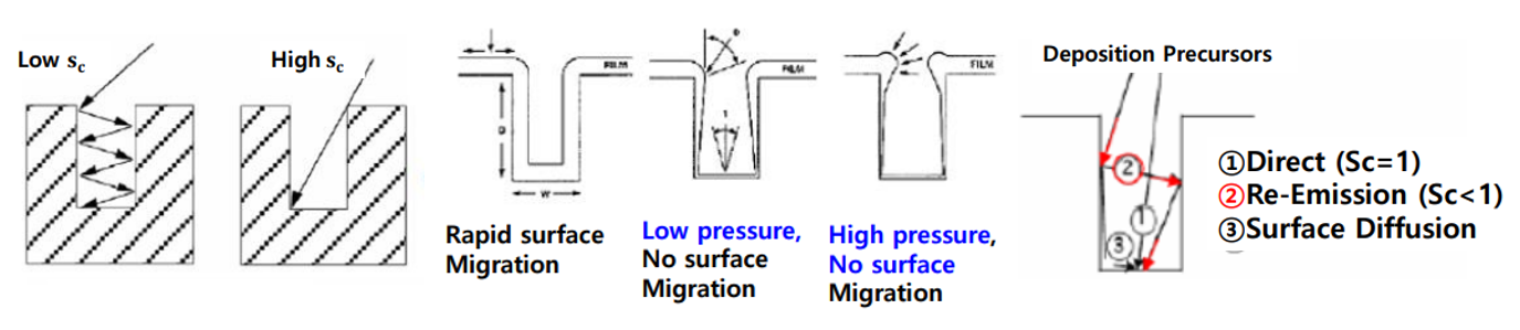 Sticking coefficient 함수는 반응가스가 외부로부터 주입돼서 표면에 얼마나 움직이 않고 붙어 있는지에 대한 지표입니다. high sticking coefficient는 migration이나 diffusion 없이 그 자리에 원자가 위치하고 있습니다. 즉, 외부에서 가스가 들어오면 확산돼서 표면에 가장 먼저 도달하는데, gap 안으로 이동하거나 확산하는 것이 미비하여 높은 Aspect ratio를 채우는 gap filling 효과가 저하됩니다. 이러한 경우, 표면에 원자가 점점 증착이 되면서 하부 gap에 void가 생기는 이슈가 발생합니다. 반대로, 도달한 가스원자가 표면에서 충분히 migration 되면 step coverage가 우수해집니다.