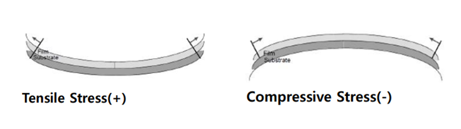 1. Tensile Stress는 박막의 열팽창계수가 Si 기판보다 큰 경우, 위로 휘게 되는 Stress 입니다. 2. Compressive Stress는 박막의 열팽창계수가 Si 기판보다 작은 경우, 아래로 휘게 되는 Stress 입니다.