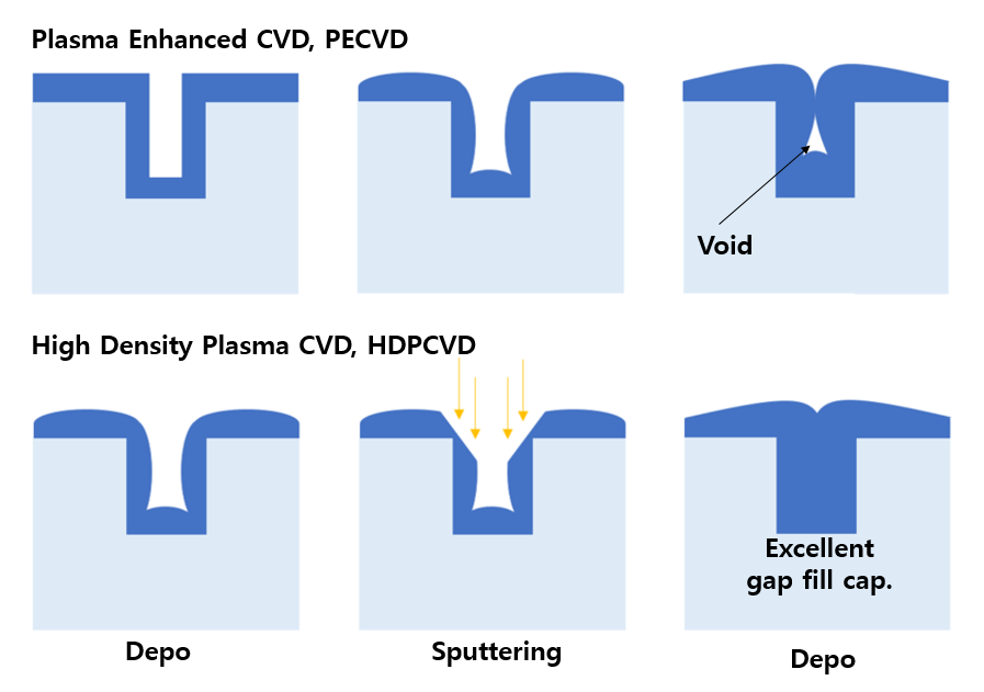HDPCVD는 PECVD에서의 저조한 Step coverage 특성 때문에 생기는 void를 메우기 위한 gap fill 방법입니다. 처음에는 Deposition 한후, 웨이퍼 back side에 RF Bias를 인가하여 sputtering을 진행합니다. 그리고 다시 deposition을 통해 gap을 채우고 Step coverage를 극대화시킬 수 있습니다. 이후 박막 상단에 불필요한 박막은 CMP 공정을 통해 평탄화 공정을 거칩니다.