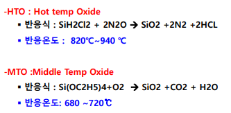 HTO, MTO는 High/Middle temperature oxide로서 증착온도와 반응가스의 종류에 따라 HTO, MTO로 구분합니다. 보통 Capacitor 구조의 유전물질, 고전압 동작 MOS 구조의 Gate oxide를 증착할 시 고온공정이 요구됩니다.
