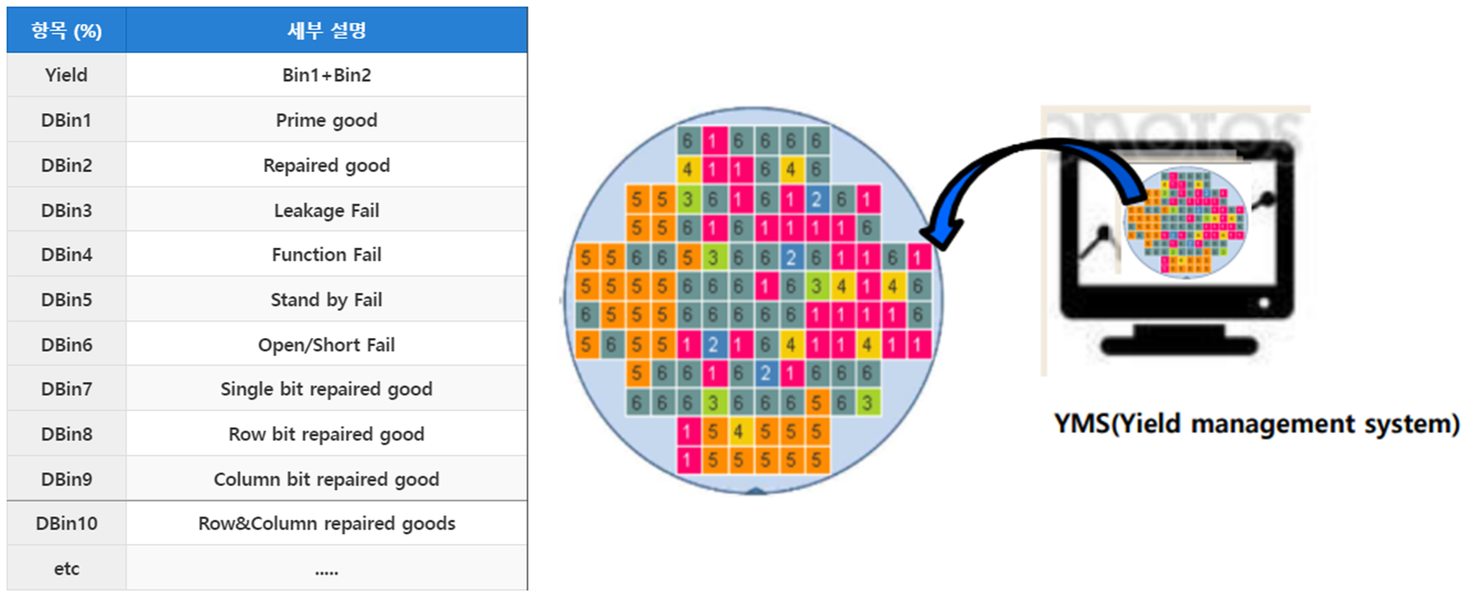 반도체 수율은 보통 EDS 수율을 의미합니다. Wafer map, Bin, Chip의 전기적 특성 등이 지원되는 YMS System으로 Extract 하여, 각종 통계적 분석 방법으로 분석합니다. Bin code는 공정 완성된 wafer를 EDS Test 장비로 chip을 test 한 후에 상태에 따라서 분류한 항목입니다. 수율이 우수한 chip은 Bin1+Bin2를 의미하며, 나머지 chip은 Fail chip으로 분류합니다. EDS 수율이 부가가치가 가장 크기 때문에 모든 역량을 EDS 수율 향상에 최대한 집중한다고 할 수 있습니다.